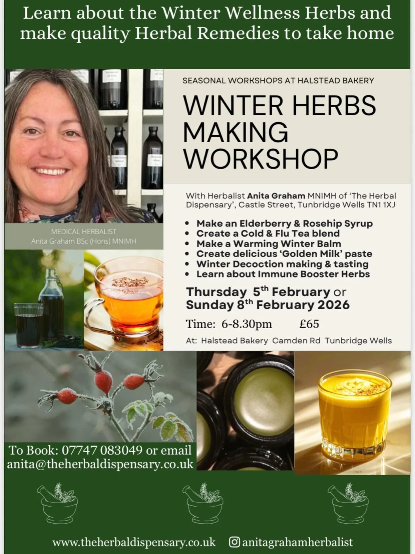 “I am full of cold and coughs presently all because I let Anita’s herbal gargle run out!” A wide range of herbal products are available at The Herbal Dispensary. They are highly effective and you can call in and get advice. The Herbal Dispensary is a huge asset to the community and Anita’s approach is professional, compassionate and cheerful.”